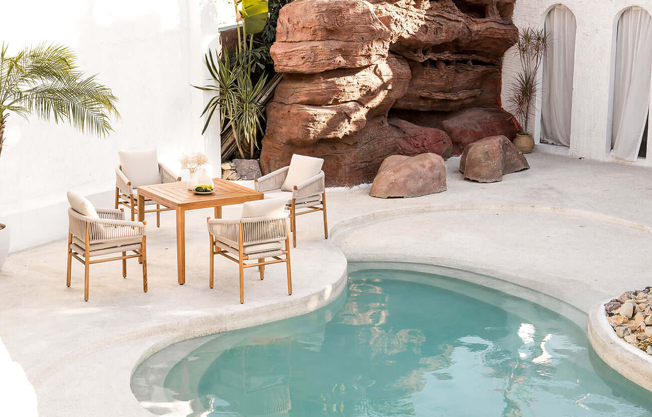 Teak’s intrinsic strength and resilience make it more than a material; it becomes a living entity that matures gracefully over time, echoing the patina of architectural facades that weather with elegance. The innate oils of this outdoor square wood table protect against decay and moisture, ensuring that the Etimoe Square Teak Table not only withstands the elements but thrives within them, much like structures designed to engage in a dialogue with their environment.