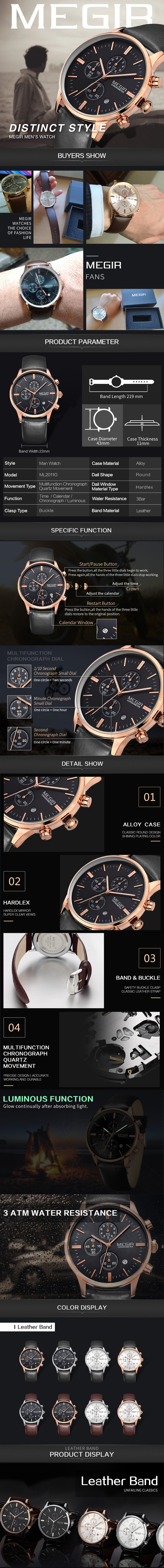 MEGIR Sport Watch for Men Luxury Waterproof Quartz Clock Leather Wristwatch Luminous Military Watches Calendar reloj hombre 2011