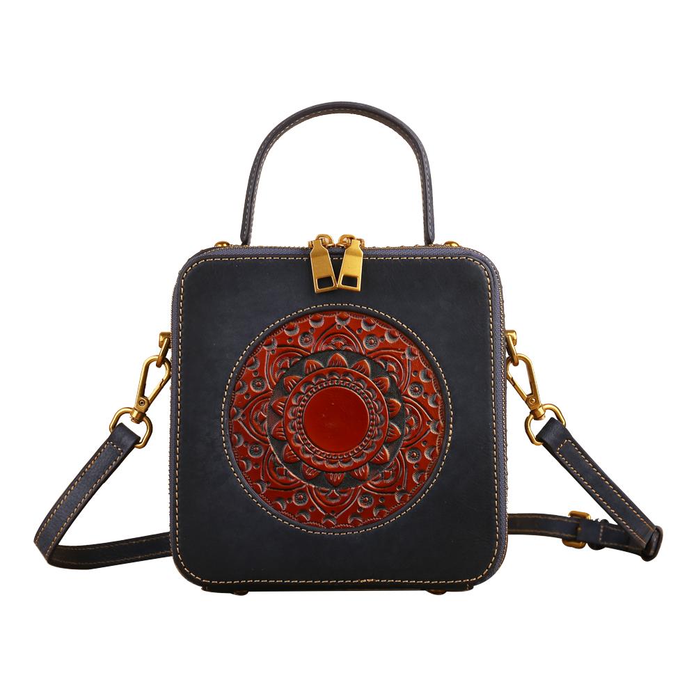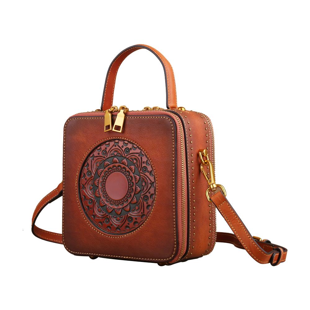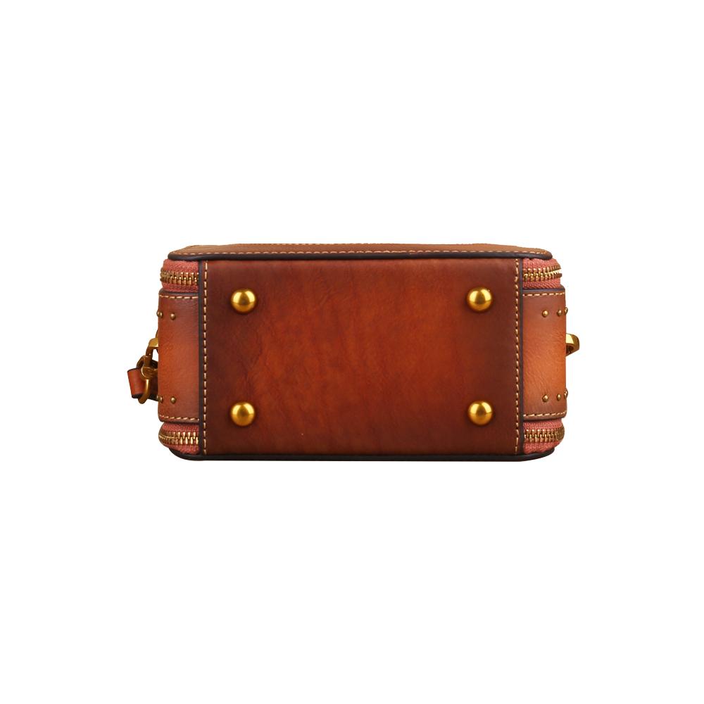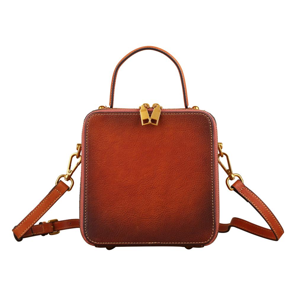 This is a compact single top handle purse and long cross body strap. It closes with zipper closure around . It has an open interior with Hand-selected, tumbled, vege distressed top grade of cowhilde leather with antique golden tone hardware.